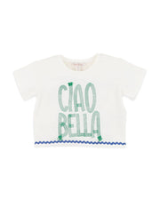 Say hello to sweet summer style with our playful Ciao Bella tee. Featuring a statement embroidered graphic and a fun ric rac trim, it's the perfect top for little adventurers ready to make memories under the sun. Just the thing for days filled with gelato, sunshine, and seaside giggles.