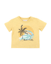 Let them chase the waves in this bold yellow surf tee, designed for sunny days and salty breezes. Featuring a retro beach scene and comfy cotton feel, it's the ultimate summer staple. Match it back with our Surfs Up stripe shorts for a laid-back coastal look.