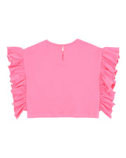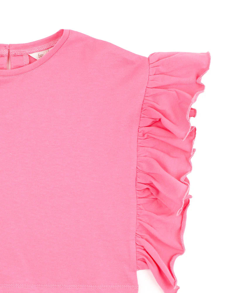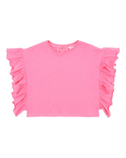 Add a pop of playful colour to her sunny day wardrobe with this vibrant pink frill tee. Soft and comfortable in cotton jersey, it's the perfect mix of bold and sweet with statement ruffle sleeves and a neat back neck opening. Whether she's heading off to a birthday party or just out for ice cream, this top brings the fun wherever she goes.