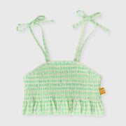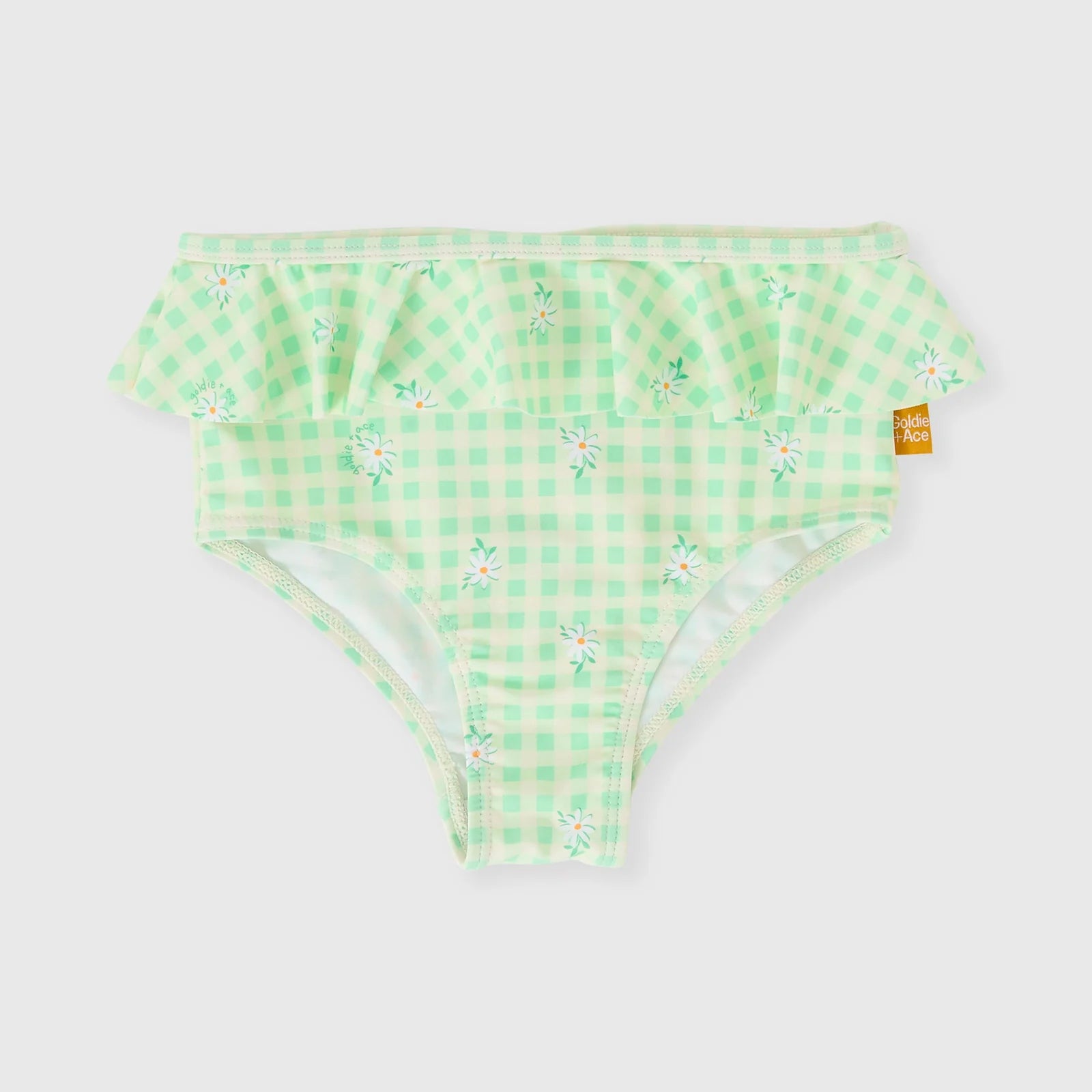 | True to size. Luxurious feel Nylon/Spandex fabrication. Featuring elasticated shirring and adjustable tie straps for room to grow and bottom elasticated at the waist and leg openings. Features a frill on the waist. |