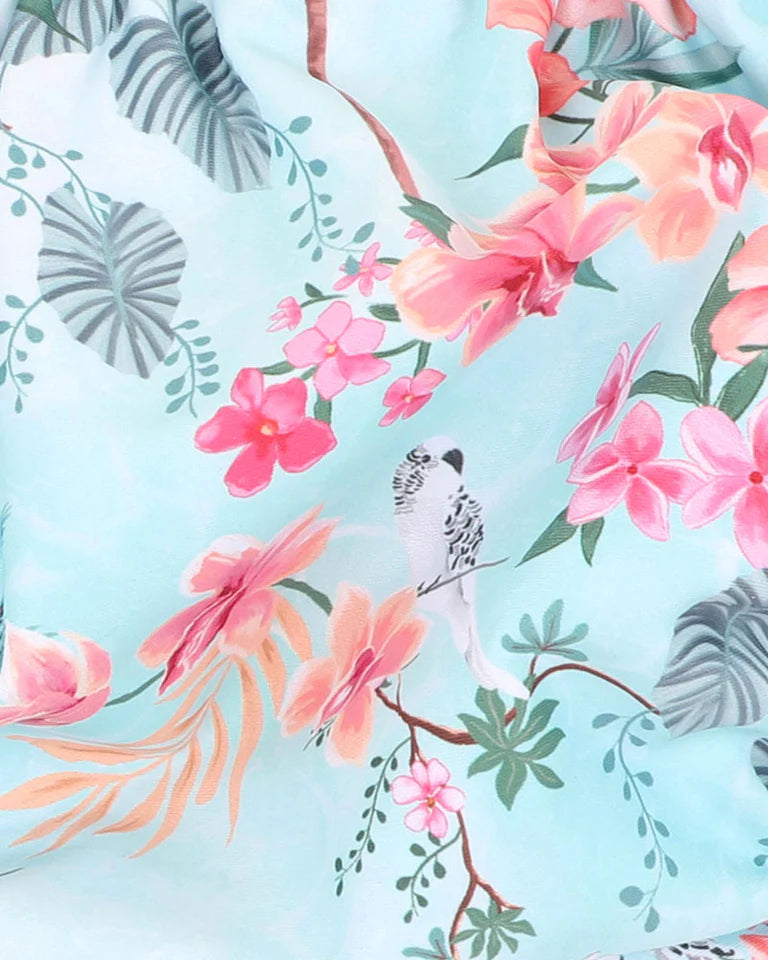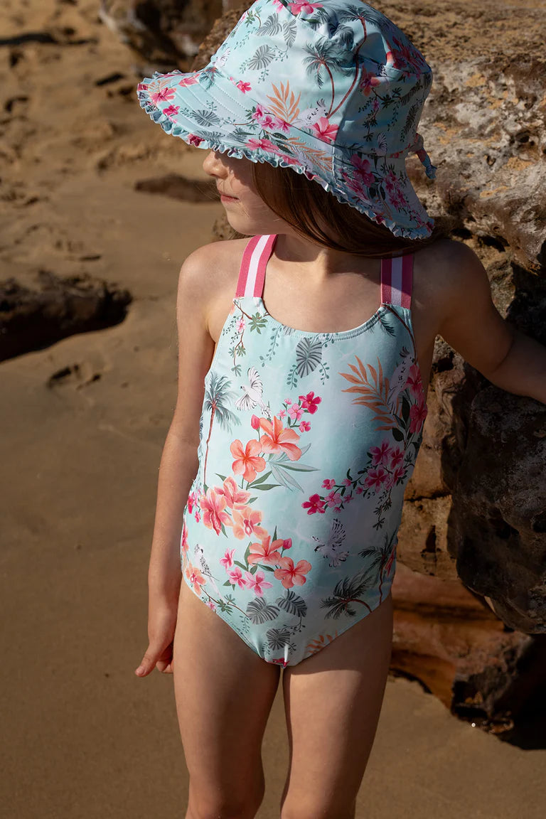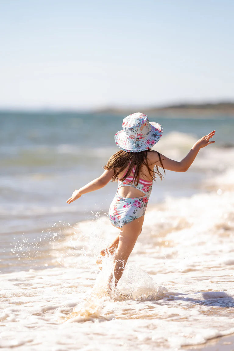 A playful twist on a classic one-piece, this swimsuit is designed for sunny days and seaside adventures. Featuring our blue tropical floral print with vibrant pink and coral tones, it's finished with contrast pink elastic straps and a bold cut-out back for extra fun.