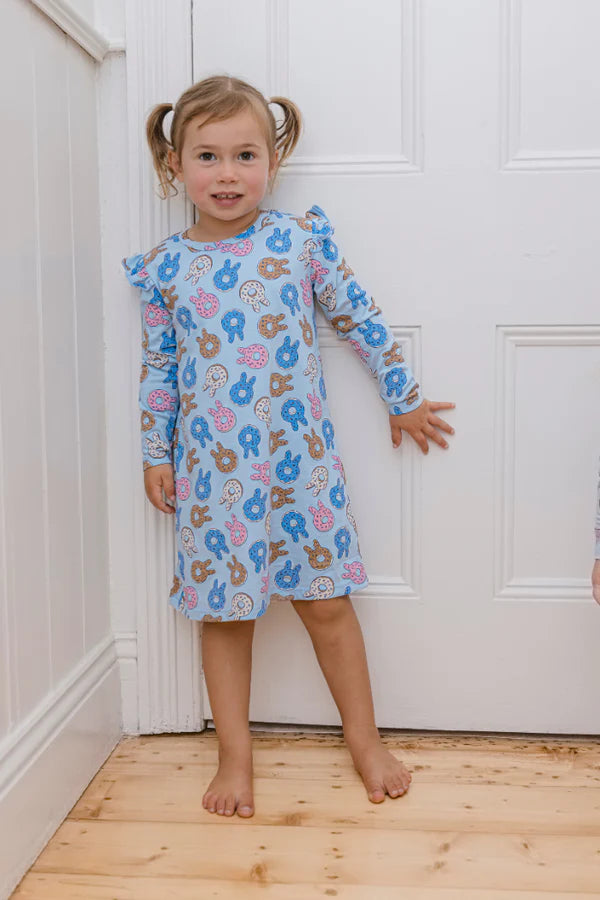 Milky Clothing Donut Bunny Nightie is made for dreamy nights and playful mornings. With our fan-fave bunny donut print on a soft powder blue base, this nightie brings the fun without skipping on comfort. Long sleeves keep little arms warm, while the frill detail at the shoulders adds just the right touch of extra cute. Pair with the Donut Bunny Zip Romper or PJs for matchy-matchy family vibes.