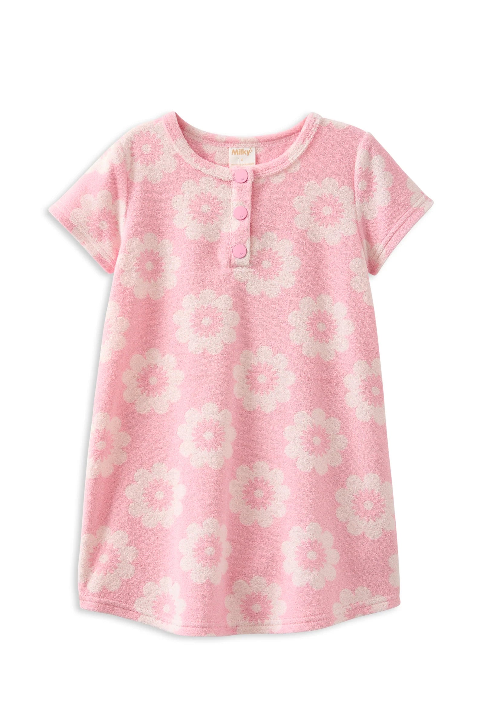 Milky Clothing Floral Terry Towelling Dress is the ultimate post swim throw on for sunny days. With a soft pink base and all-over off-white flower print, this dress is both fun and functional. Made from classic terry towelling fabric, it helps absorb moisture and keeps your little one comfy and dry after a day at the beach or by the pool. The centre front neck snap closure makes dressing quick and fuss-free, perfect for busy summer days.