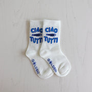 The Ciao Tutti Pesci socks are the perfect finishing touch for your little one's outfit. Our ribbed socks are designed with reinforced toe caps featuring the words CIAO TUTTI and a fish to the top of each sock. The footbed features the Golden logo. The print is inspired by our love of the phrase 'Ciao Tutti!'