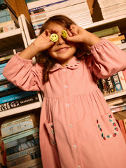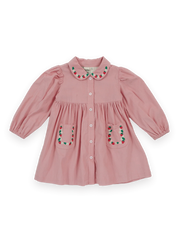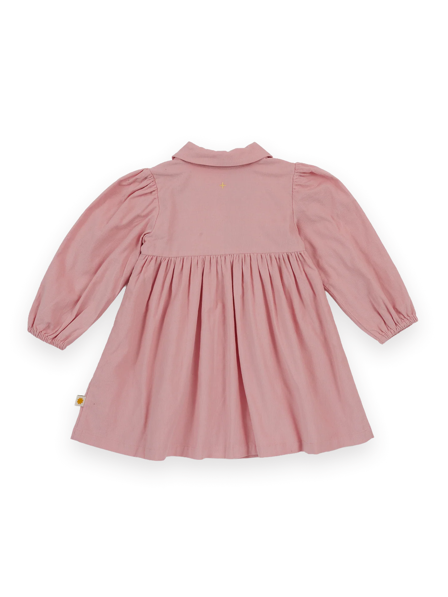 A pink cotton corduroy delight with a touch of whimsy, this dress is all about playful charm. The soft corduroy fabric is perfect for twirling, while elasticated cuffs keep sleeves in check.