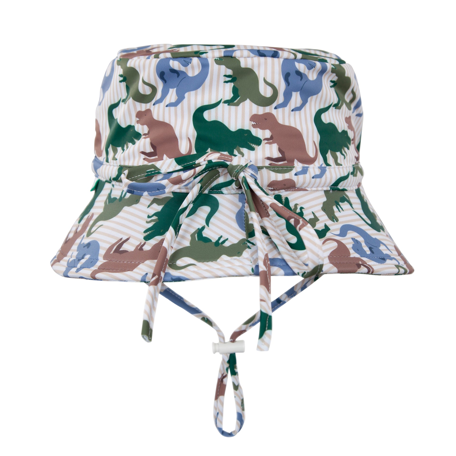 Roar into summer fun with the T-Rex Wide Brim Swim Hat, featuring a playful T-Rex dinosaur print designed by Jacinta Weir from Two Little Ducklings.