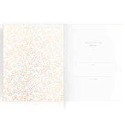 220 x 280 mm (15mm spine) / 8.6 x 11 inches (0.59 inch spine). Gold foil stamped printed linen cover. White grosgrain ribbon. 2mm foil stamped hard cover, lay-flat binding. Gold foil end pages and premium 115gsm FCS-certified acid-free paper. Packaged in a cello sleeve with gold foil bellyband. Designed in Australia, printed in China.