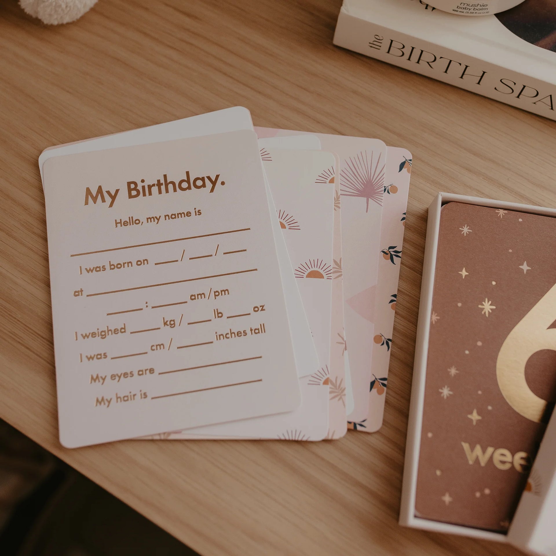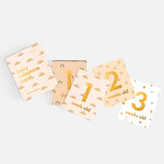 Includes 34 cards with rounded corners safe for little hands, a special card for your birth announcement, plus all the important milestones from one day old to one year old. With gold foil on every card.
