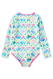 Milky Clothing Aloha Long Sleeve Swimsuit. Make a splash in style with our Aloha Swimsuit. Featuring a vibrant all-over fresh tropical print, this swimsuit is designed to keep your little one sun-safe and swim ready. With full length sleeves and a UPF 50+ rating, it's perfect for long days at the beach or by the pool.