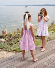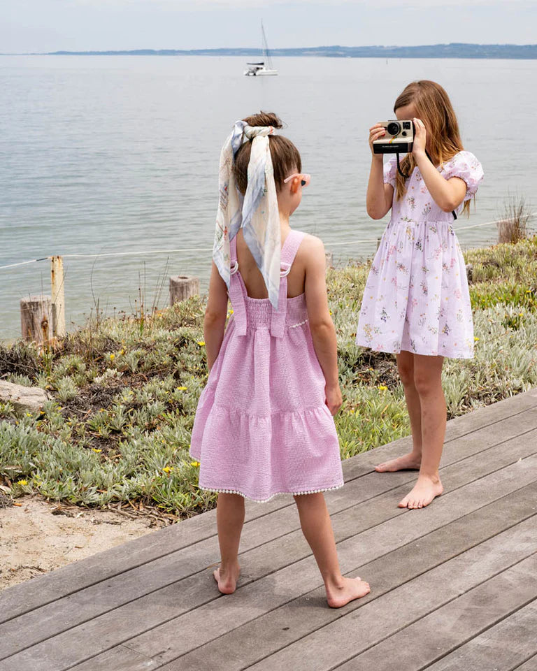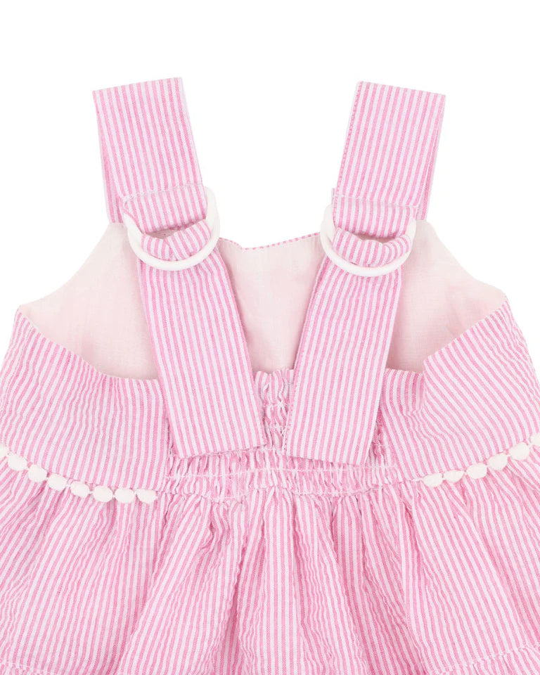 A sweet seersucker moment in soft pink and white, this tiered baby dress is made for sunshine days and garden play. Pretty pom pom trim and wide straps complete the charming look.