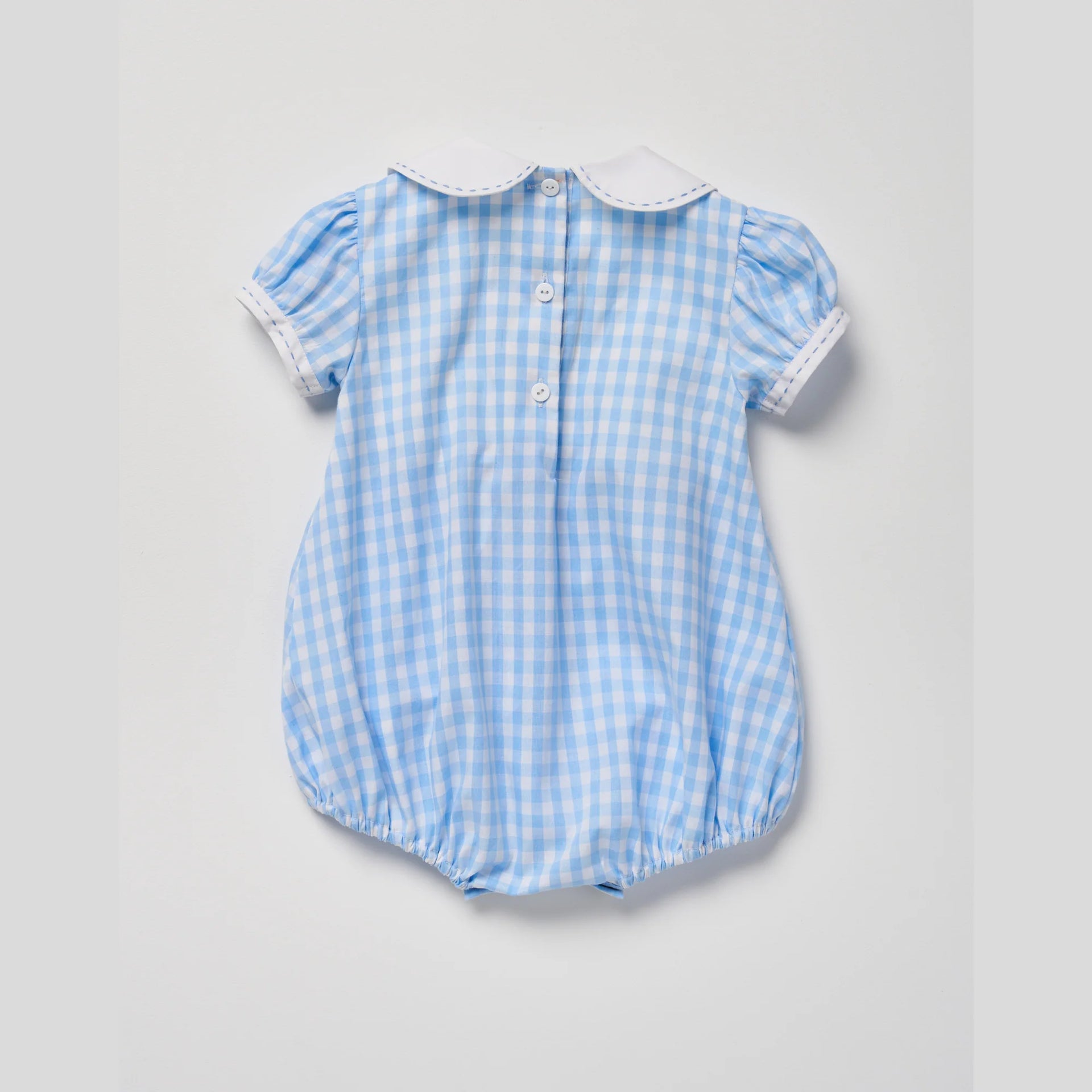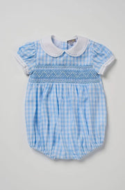 Smox Rox classic , white Peter Pan collar with hand stitched blue edging. Exquisite blue and white hand smocking on bodice. Hand stitched edge on puff sleeve. Pure white buttons at back . Stud crotch.