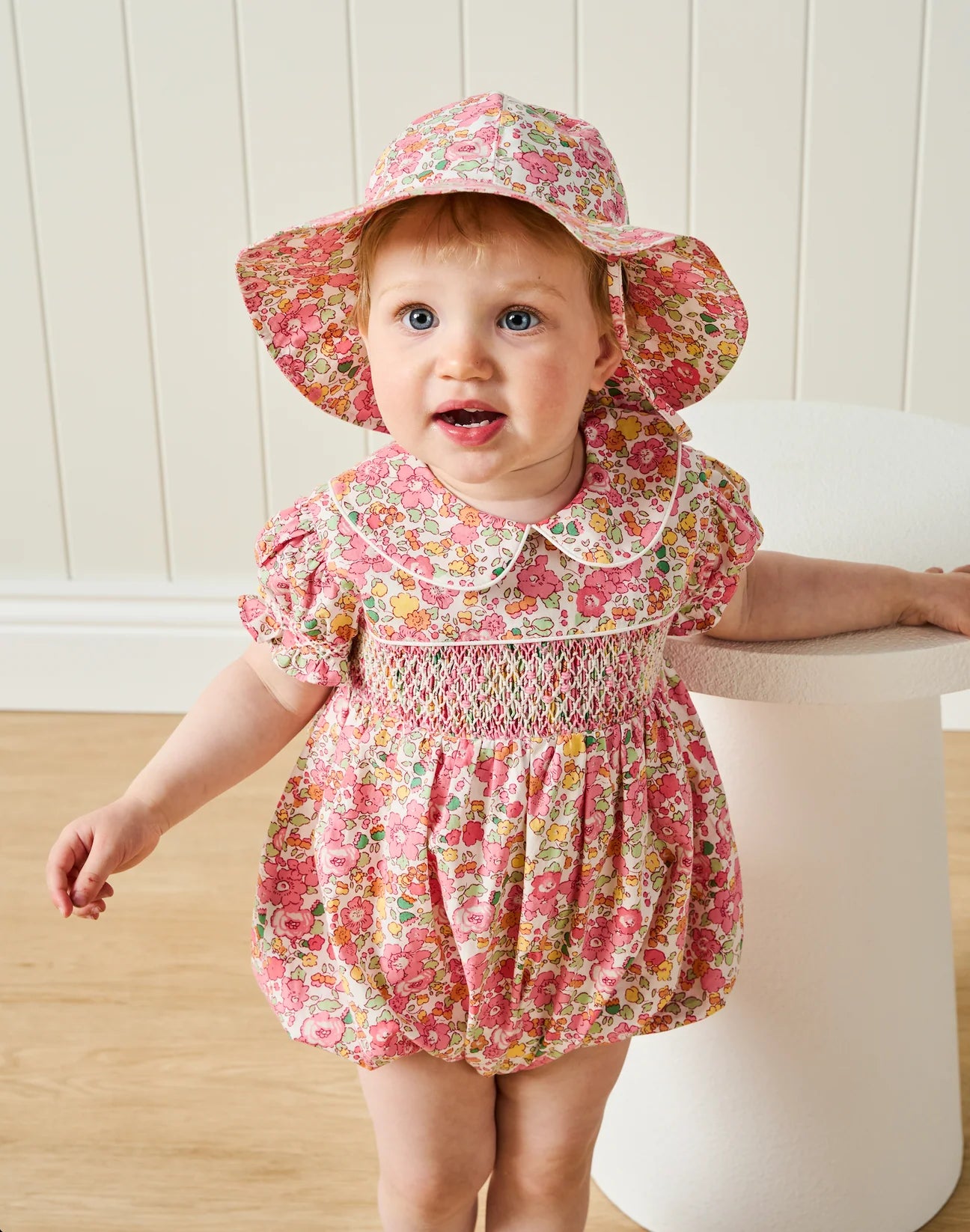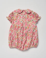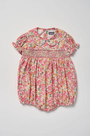 Smox Rox Classic with fabric Peter Pan collar edged in white. Classic white hand smocking with pink stitch. Loose puff fabric sleeve with white piping across front. Stud crotch.