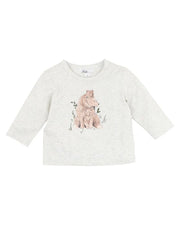 This long sleeve crew neck tee features a sweet graphic on the front and a concealed press stud shoulder opening making it a great basic for your little one's Winter wardrobe to wear back with the Boys pull on jeans or the Mateo stripe leggings for a complete outfit.