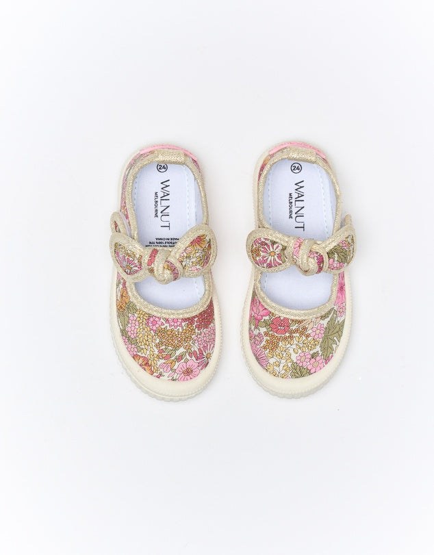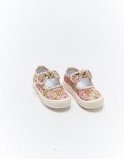 The Liberty Mary Jane in Margaret Pink features a vibrant all-over floral print with a simple velcro strap for easy on and off.