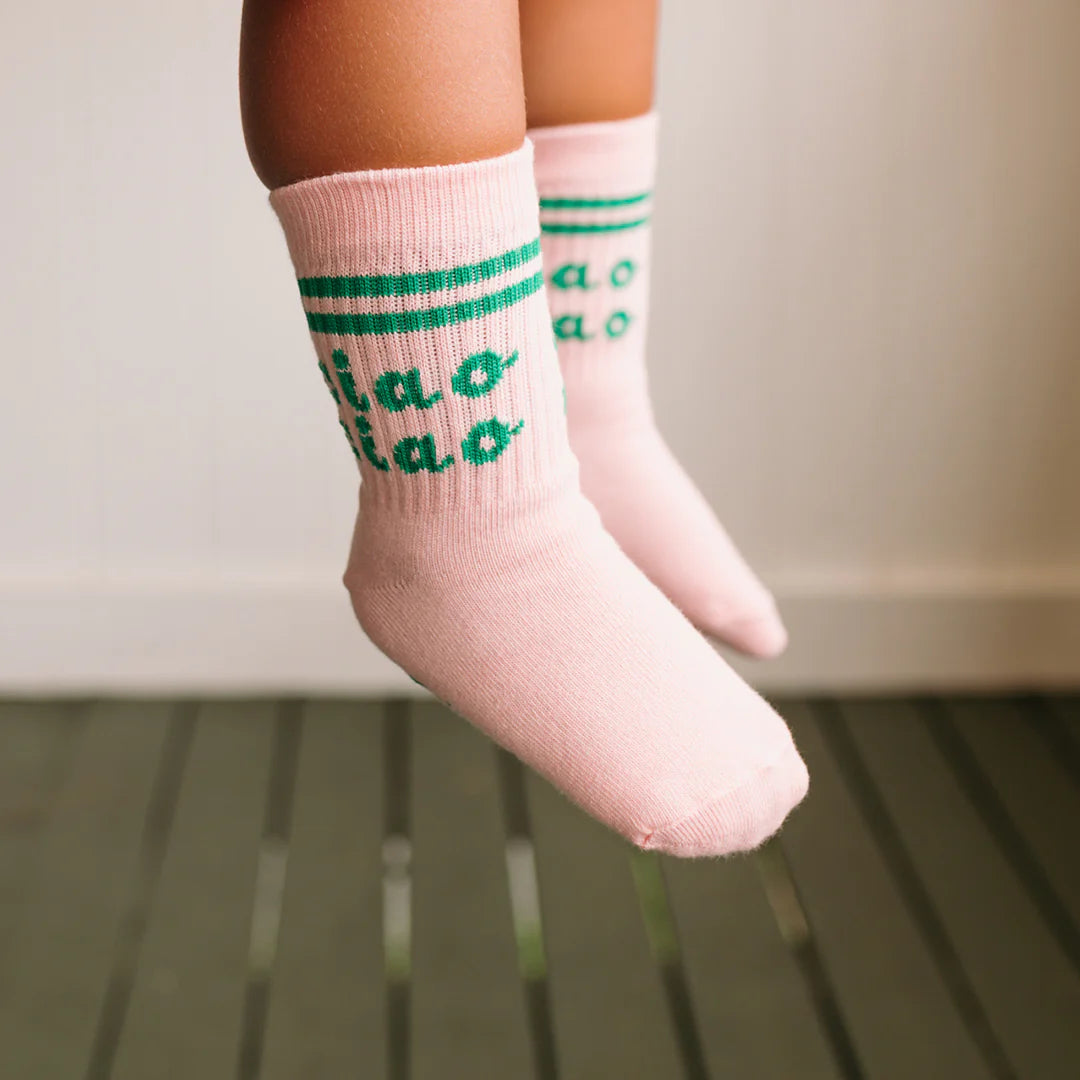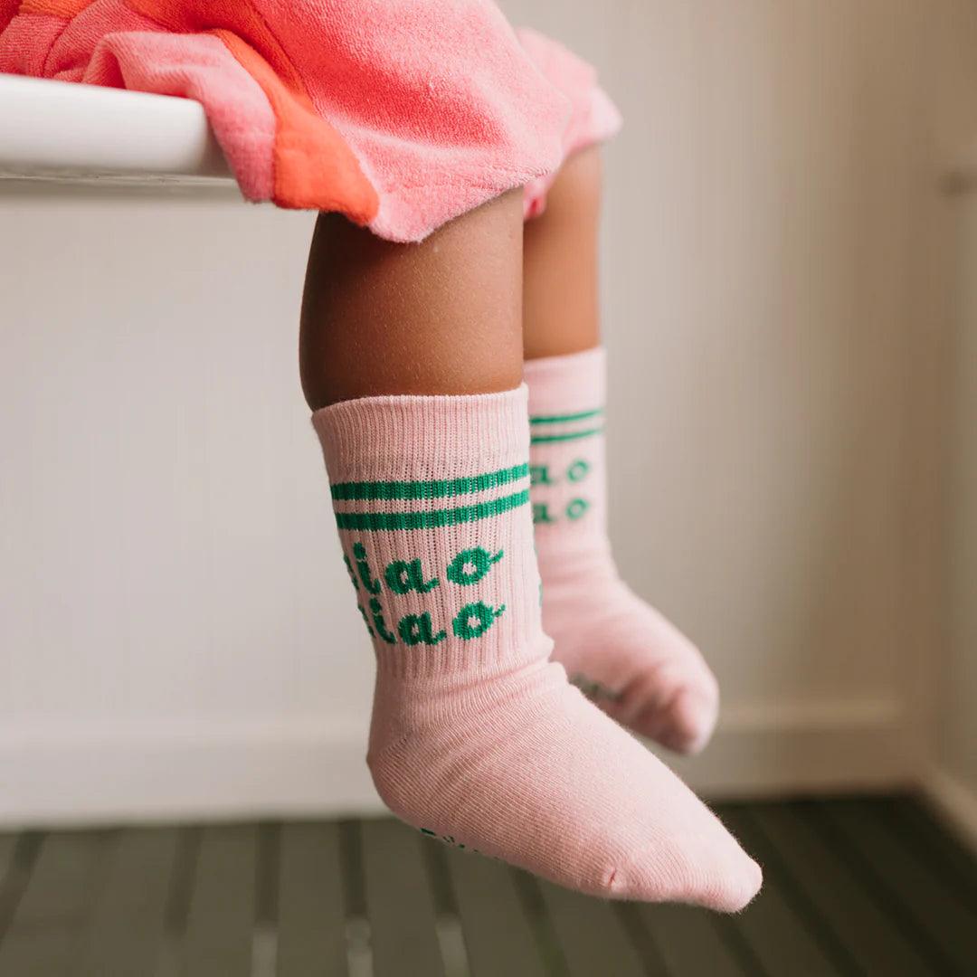 The Ciao Ciao socks are the perfect finishing touch for your little one's outfit. Our ribbed socks are designed with reinforced toe caps featuring two stripes, the words CIAO CIAO to the top of each sock. The footbed features the Golden logo. The print is inspired by our love of friends!