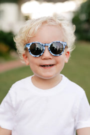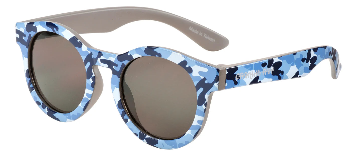 PIXIE in blue camo print is made from an all rubber frame so big on comfort and flexibility for your little one...and they don't fall off!