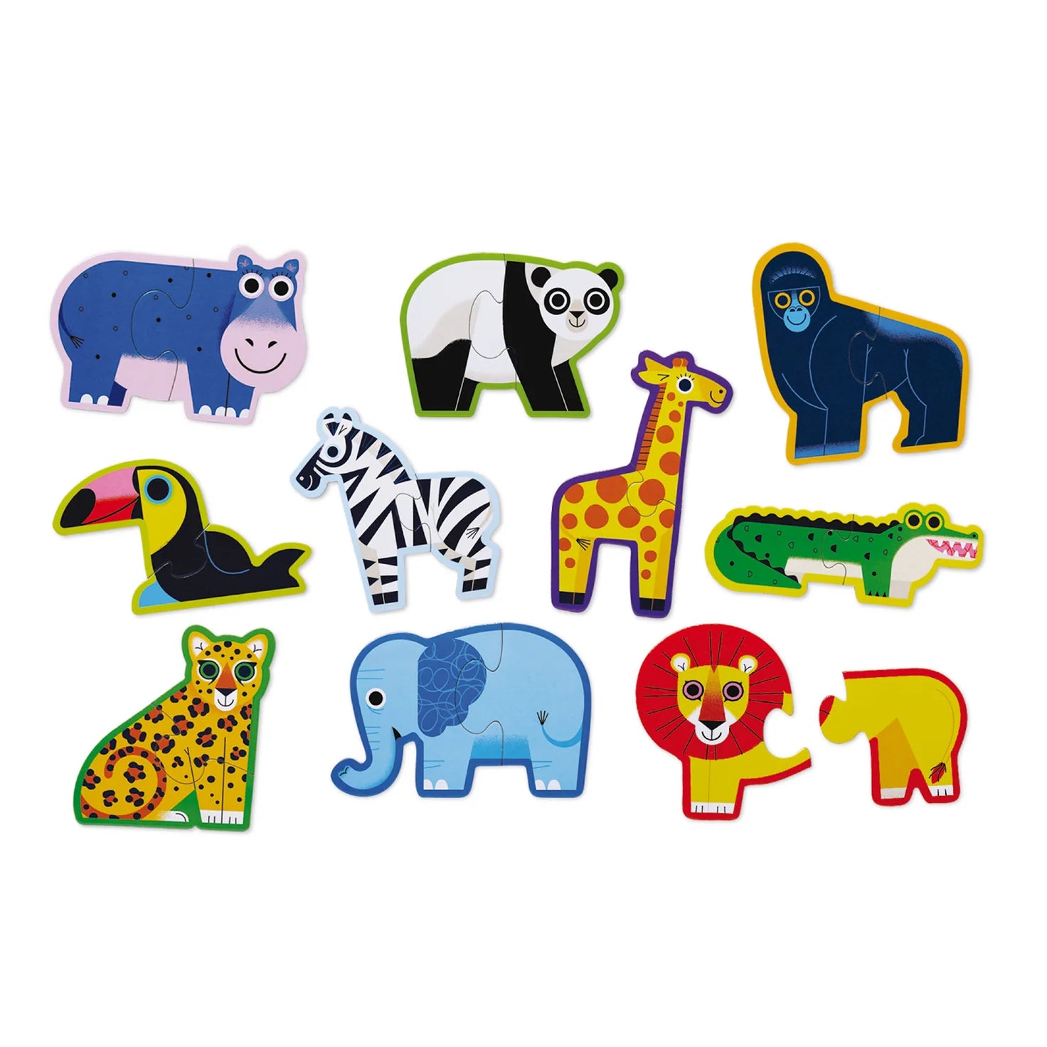 - 10 different 2-piece puzzles with pieces perfect for little hands